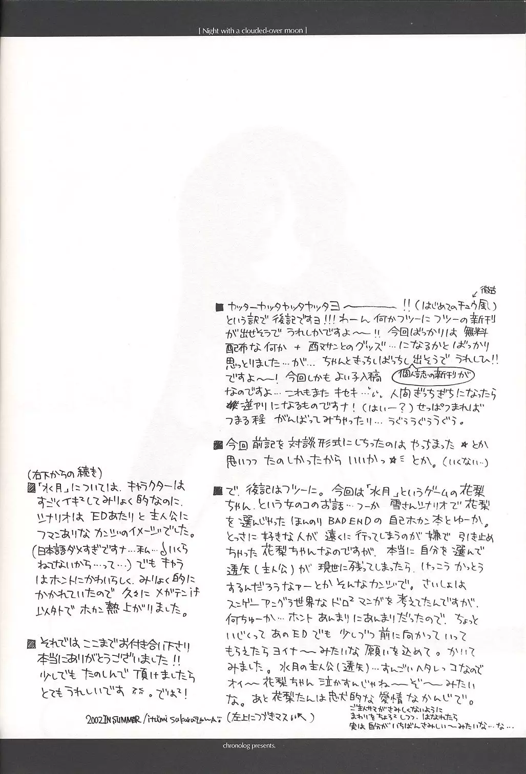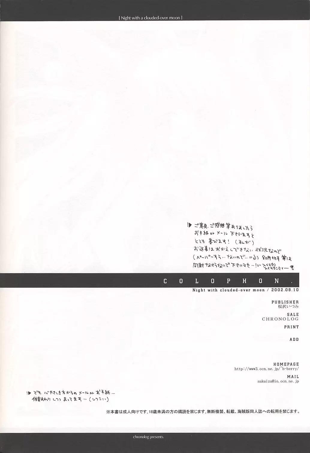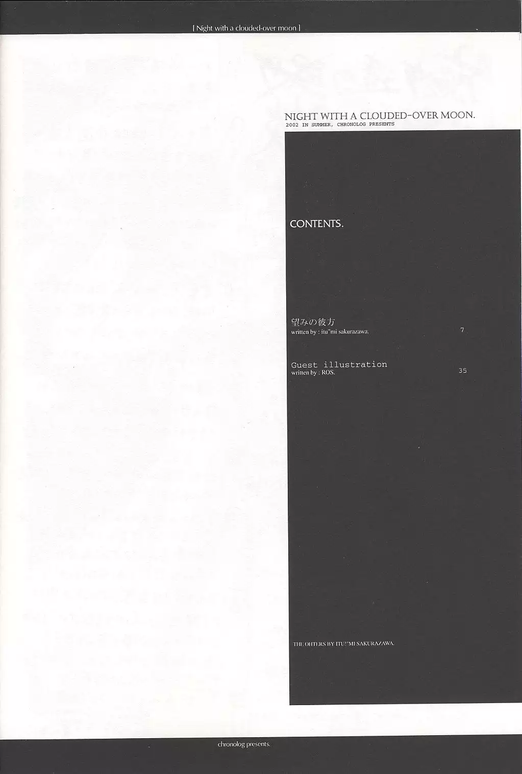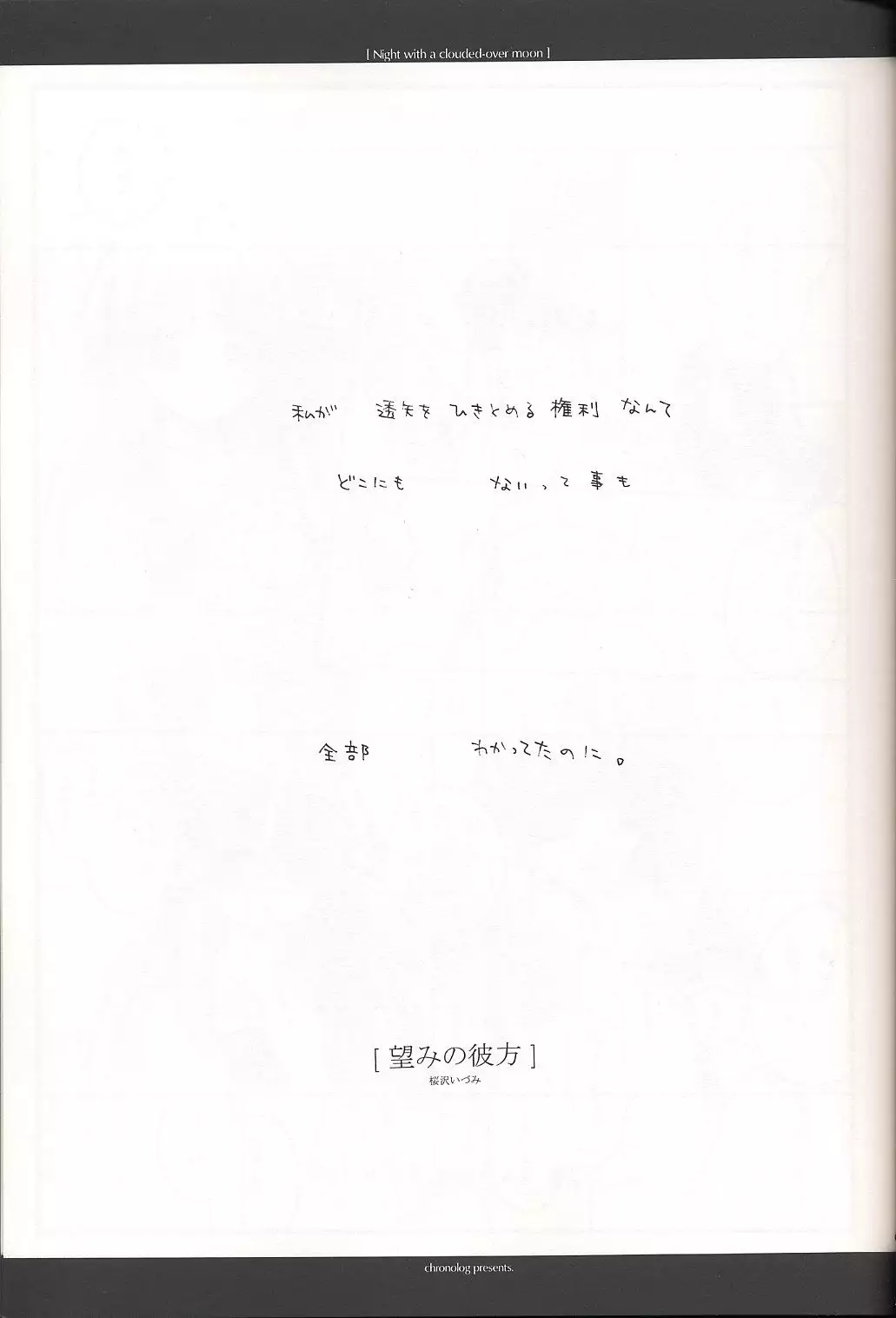 (C62) [Chronolog (Sakurazawa Izumi)] Night with a clouded-over moon (Suigetsu) Hentai (C62) [CHRONOLOG (桜沢いづみ)] Night with a clouded-over moon (水月)