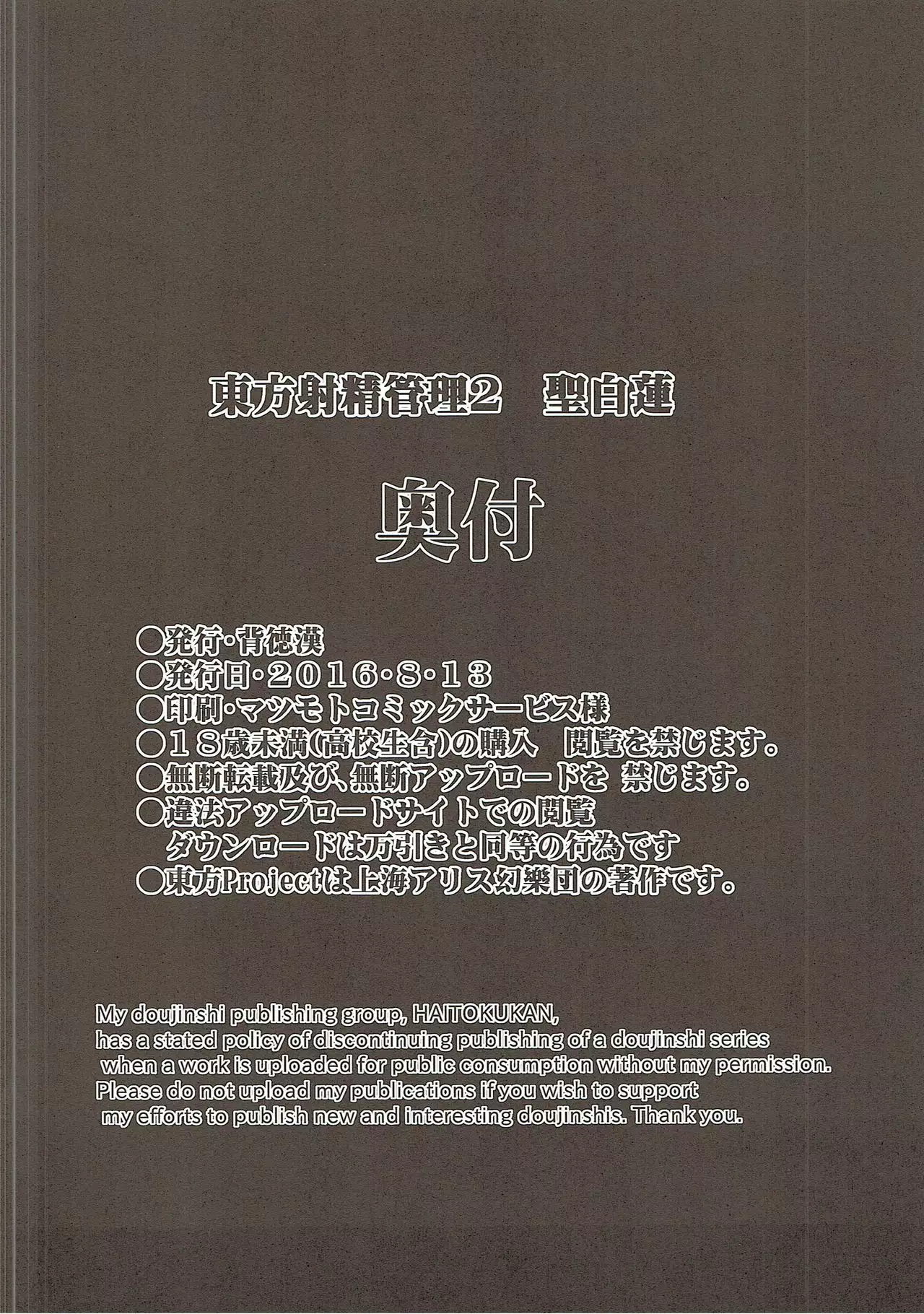 (C90) [Haitokukan (Haitokukan)] Touhou Shasei Kanri 2 Hijiri Byakuren (Touhou Project) Hentai (C90) [背德漢] 東方射精管理2 聖白蓮 (東方Project)